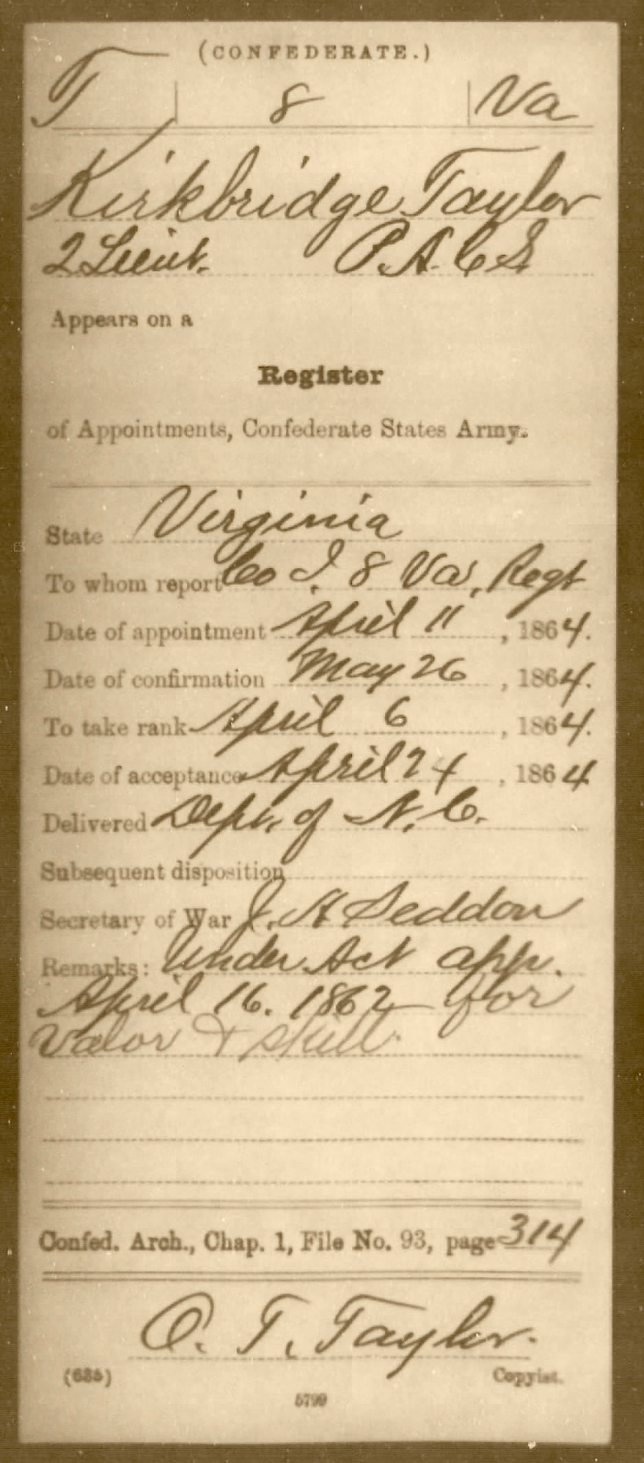 0 comments on “Kirkbride Taylor, 8th Virginia Infantry, Confederate Army”