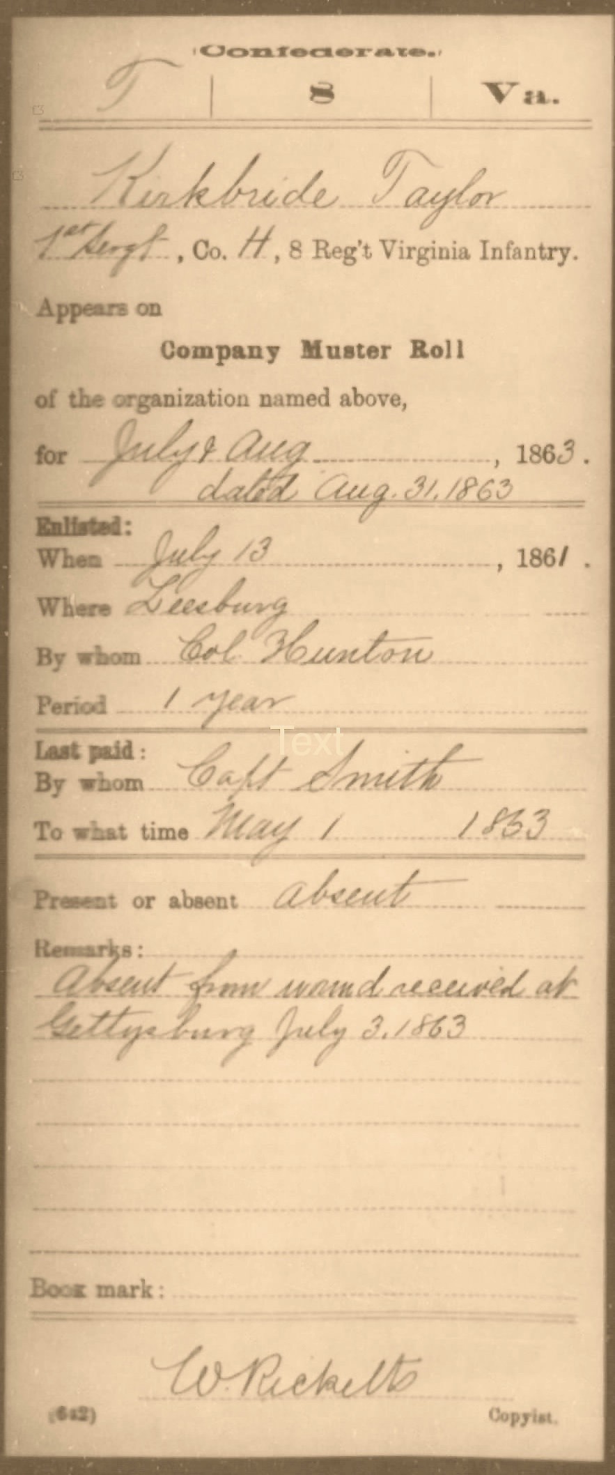 Kirkbride Taylor made a choice to enlist in the 8th Virginia Infantry. The 8th VA Infantry was full of local Loudoun boys and men, mustered out of Leesburg, Virginia. Kirkbride enlisted in July 1861 and stayed throughout the entire war with the 8th VA. He fought at Gettysburg and on July 3, 1863, the last day of that three day battle, Kirkbride participated in Pickett’s Charge, surviving being shot in the head. To recover from his injury, it is likely he returned to the family home near Lincoln since he is shown “absent” for July/August 1863, rather than listed as in hospital. Kirkbride Taylor suffered three injuries during the four years of war, recovering from each and returning to the fight.