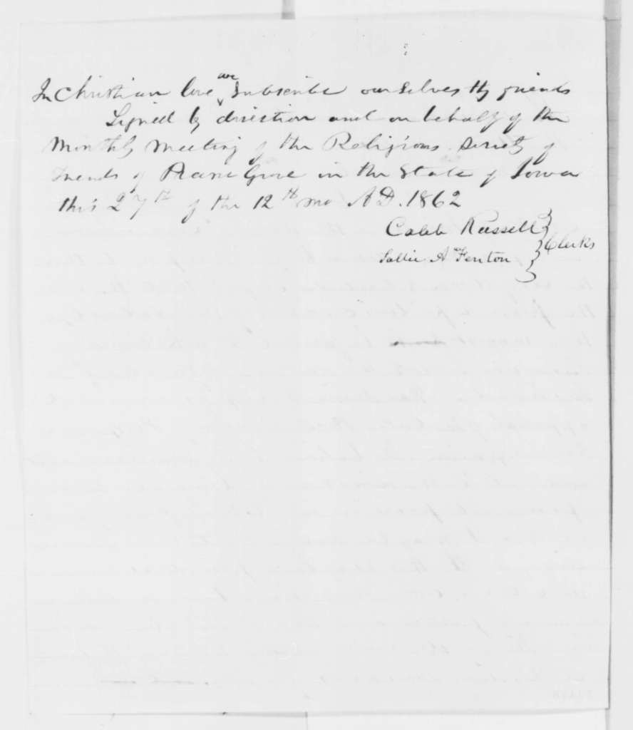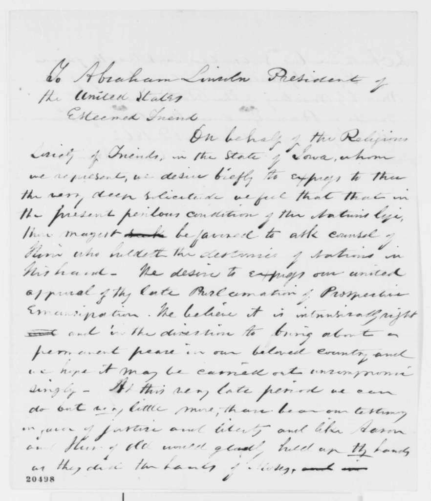 On behalf of the Religious Society of Friends, in the state of Iowa, whom we represent, we desire briefly to express to thee the very deep solicitude we feel that in the present perilous condition of the nation’s life thou mayest be favored to ask counsel of Him who holdeth the destinies of nations in his hand. We desire to express our united approval of thy late Proclamation of Prospective Emancipation. We believe it is intrinsically right and in the decision to bring about a permanent peace in our beloved country and we hope it may be carried out uncompromisingly – At this very late period we can do but very little more, than bear our testimony in favor of justice and liberty and like Aaron and Him of old would gladly hold up thy hands as they did the hands of Moses In Christian love, we subscribe ourselves thy friends.