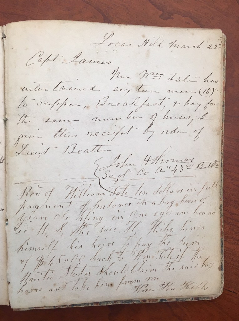 Rec’d of William Tate ten dollars in full payment of balance on a bay horse 8 years old bling [blind] in one eye and branded U.S. the said H. Hibs [sic] binds himself his heirs to pay the sum of $65 back to Wm Tate if the United States should claim the said bay horse and take him from me. Wm H. Hibbs