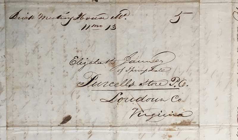 One letter Elizabeth wrote her husband was from Springdale, the boarding school for girls as well as being the Janney family home, on September 27, 1853. Part of her letter states: “…Cornelia [daughter] desires me to say to thee that our school for the coloured children has been well attended since thy absence. Last first day [Sunday] morning they had one young man. I think there is an increasing interest felt in it by the coloured people. If they cannot make much progress in learning in the short time allotted them to study, if it only convinces them there are some white people who feel a disinterested desire to do them good, such efforts I think will have a good effect upon their minds.”