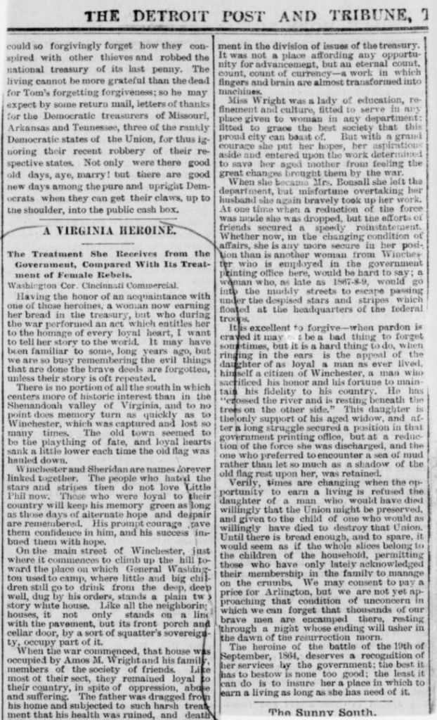 Philip Sheridan kept several newspaper articles about Rebecca Wright, including the one shown below. He had intervened in her post-war life, helping her get a Washinton, D.C. government job to support her family. Wright had to leave Winchester; townspeople there resented her Federal help during the war. This newspaper article, written in 1883, tells the “Quaker girl spy” story. In spite of the era’s sentimental style, we learn details about the spying incident with Thomas Laws, as well as about Rebecca Wright’s life. Read down the first column, then to the second scan below, finishing the left side column, then come back up to the second column.