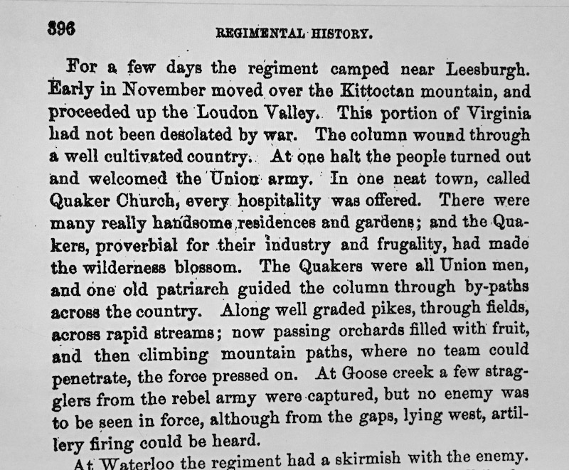 The same Indiana trooper’s further recollection is below. He mentioned “Quaker Church,” but there is no community called “Quaker Church” in Loudoun county. It likely is a reference to Lincoln, which at that time was called “Goose Creek.” The Quaker meeting in the village was named Goose Creek; in fact, the village was often listed on maps as “Goose Creek Meeting.” In other words, the village had the name of its “Quaker church.” It is a safe assumption to make that the writer was referring to Quakers in the Lincoln area. If only we could know who the “old patriarch” was who guided the Union infantry through “by-paths across the country.” Yardley Taylor? William Tate?