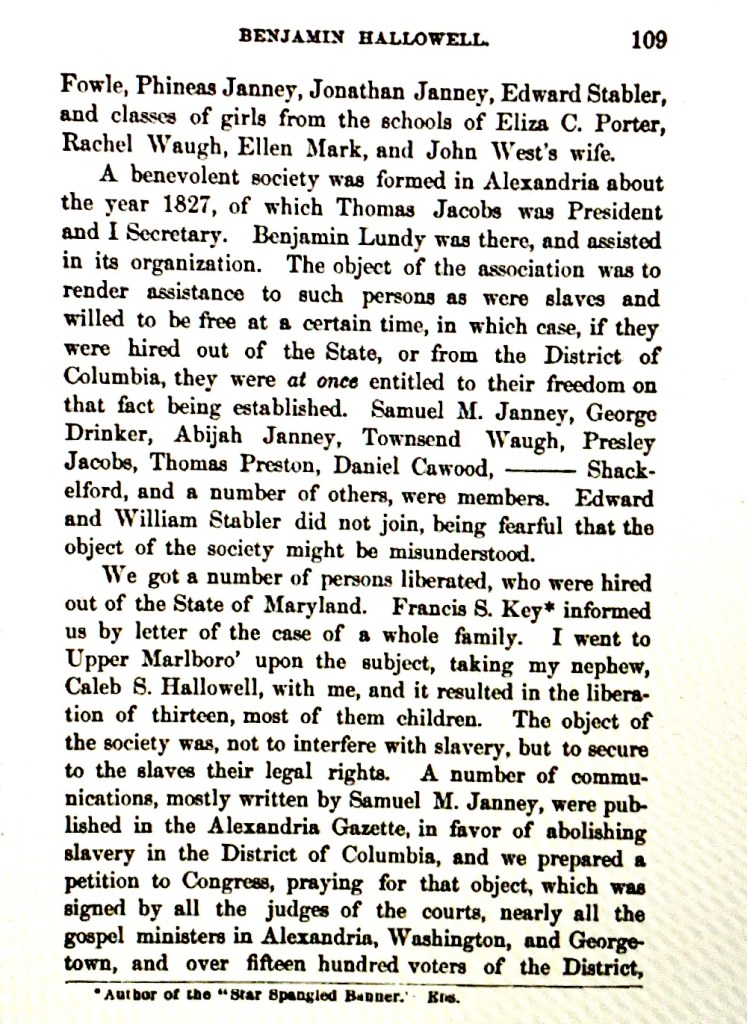 The Janneys and the Hallowells, like most Quakers, held anti-slavery beliefs. According to the City of Alexandria, Virginia website: “The Society of Friends was particularly active in encouraging gradual abolition, with or without colonization. Formed in Alexandria in 1827, a Quaker-led “Benevolent Society for Ameliorating and Improving the Condition of the people of Color” assisted with manumissions and published a series of anti-slavery essays.” Samuel M. Janney wrote the series of anti-slavery essays referred to on the City of Alexandria website; the essays were published in the Alexandria Gazette. They can be read here.