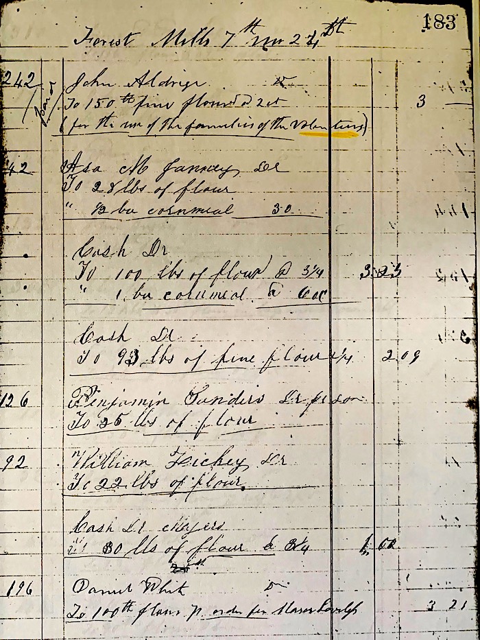 paid, John Aldridge, To 150 lb at 2 ct (for the use of the families of the Volunteers)” Forest Mills Day Book copy, private collection.