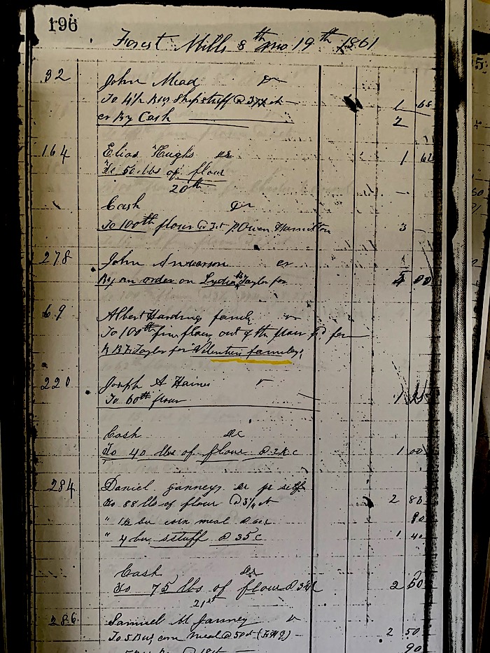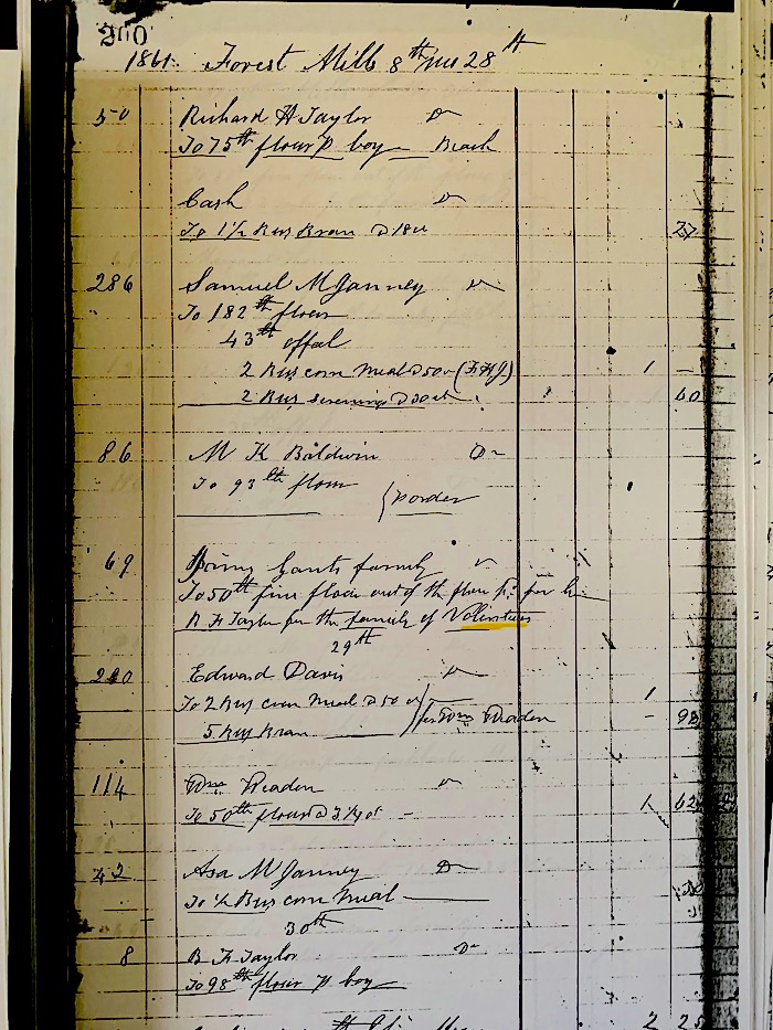 B. F. Taylor took on the task of paying for, or perhaps at least occasionally receiving donations, of Forest Mills’ flour to be delivered to various volunteer families. “B.F. Taylor” may have been Benjamin Fenelon Taylor (1830-1910) a disowned Quaker who lived in Loudoun County and would be buried in 1910 in nearby Purcellville’s Baptist cemetery. According to historian John Divine’s 8th Virginia Infantry (H.E. Howard, Inc. 1983), at the outbreak of Civil War, B.F. Taylor enlisted in the Confederate 8th Virginia Regiment. Other 8th Virginia Regiment men include those named Harding, Gants, Whitmore, Whitman, Thomas, and Shipman, all “volunteer” names listed in the mill’s ledger. It is likely the flour, either bought or donated, went to these men’s families.