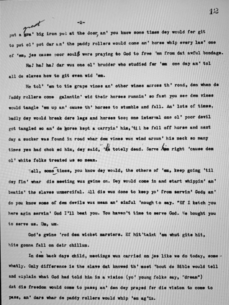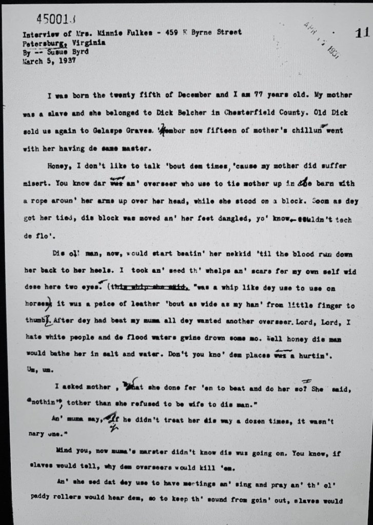 “…the paddy rollers would come an’ horse whip every las’ one of ’em, jes cause poor souls were praying to God to free ’em from dat awful bondage.” – Quote from Virginia ex-enslaved Mrs. Minnie Fulkes’ in her Work Projects Administration interview.