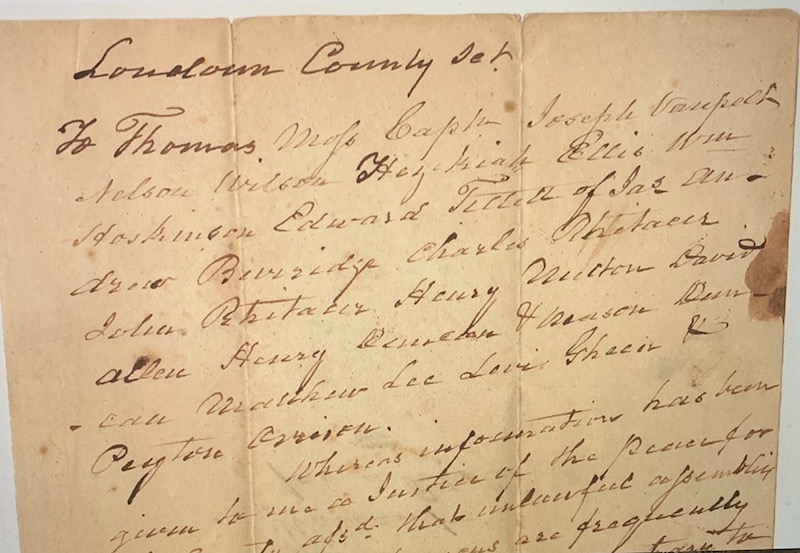 This September 2, 1826 Loudoun County warrant ordering a slave patrol, partially shown below, because “an unlawful assembly of slaves & other persons are frequently held in this neighborhood, contrary to the Act of Assembly…“