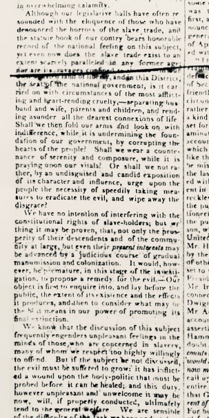 Although our legislative halls have often resounded with the eloquence of those who have denounced the horrors of the slave trade, and the statute book of our country bears honorable record of the national feeling on this subject, yet even now does the slave trade exist to an extent scarcely paralleled in any former age; nor are its ravages confined to [illegible] land of liberty, and in this District, the seat of the national government, is it carried on with circumstances of the most afflicting and heart-rending cruelty, – separating husband and wife, parents and children, and rending asunder all the dearest connexions [sic] of life. Shall we then fold our arms and look on with indifference, while it is undermining the foundation of our government, by corrupting the hearts of the people? Shall we wear a countenance of serenity and composure, while it is praying [sic] upon our vitals? Or shall we not rather, by an undisguised and candid exposition of its character and influence, urge upon the people the necessity of speedily taking measures to eradiate the evil, and wipe away the disgrace?