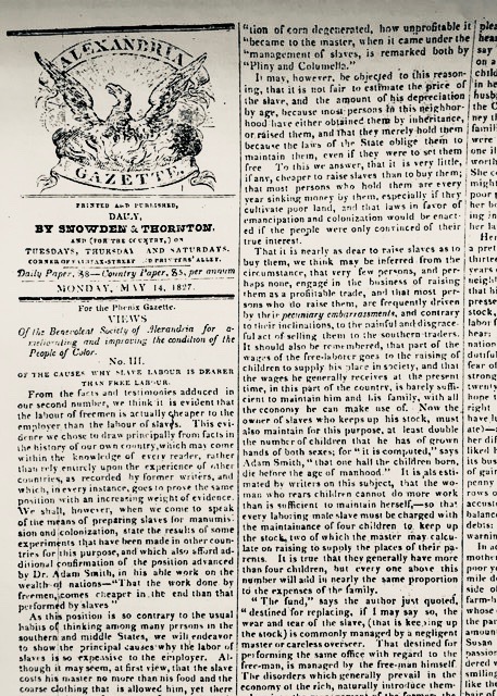 Readers of the following Monday’s Alexandria Gazette, published on May 7, 1827, found the second in the series of Samuel Janney’s anti-slavery essays: “No. 2 On the Comparative Cost of Free and Slaver Labour.” In this essay, Janney compared expenses associated with slave ownership versus paying wages to free laborers. He made his argument, using examples, that it was a false economy that claimed enslaved workers were a financial benefit to the white ownership class. No. 2 essay is shown below: