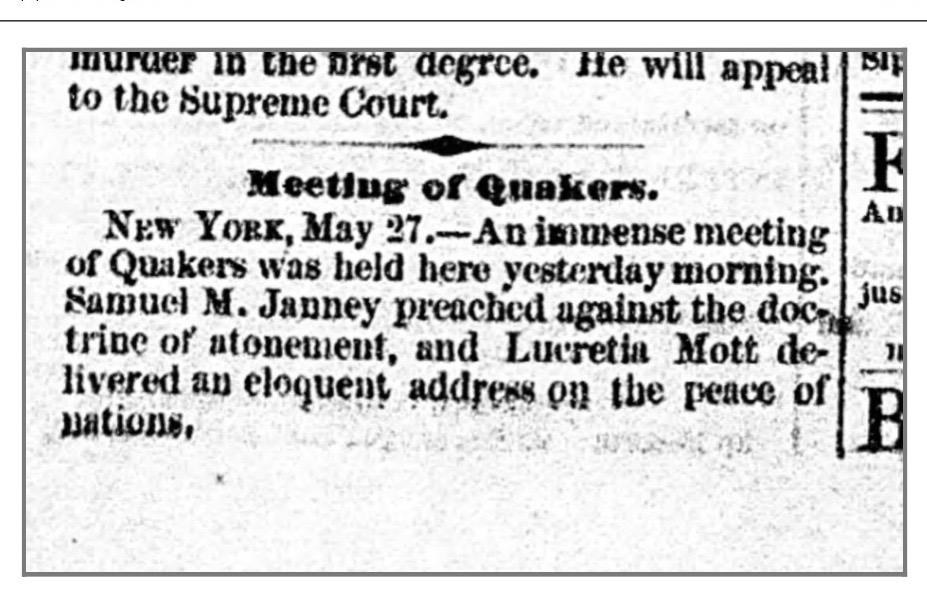 Lincoln’s educator and anti-slavery activist Samuel M. Janney was strongly influenced by Lucretia Mott. Dr. A. Glenn Crothers wrote about Janney’s reaction to Lucretial Mott in a 2006-2007 article for the Southern Friend: Journal of the North Carolina Friends Historical Society, including the following excerpt: